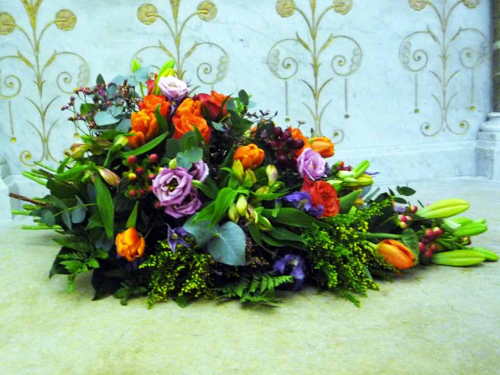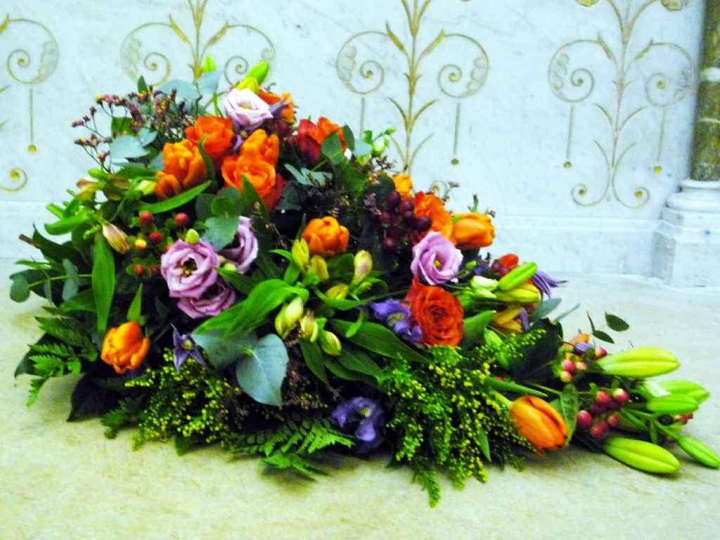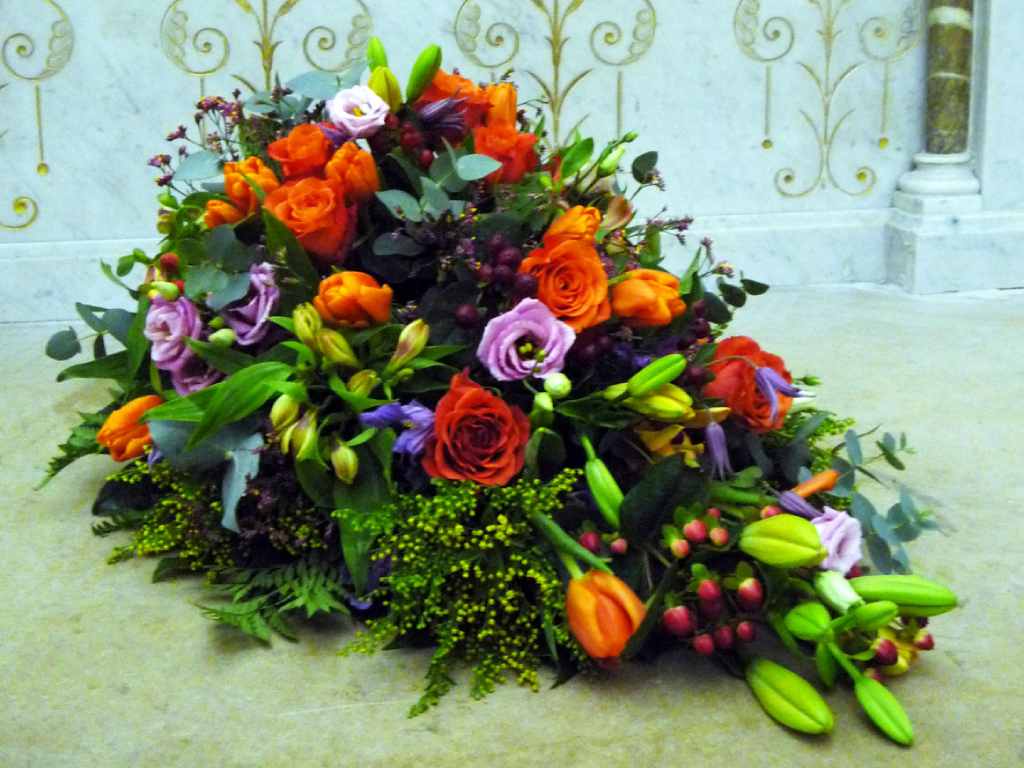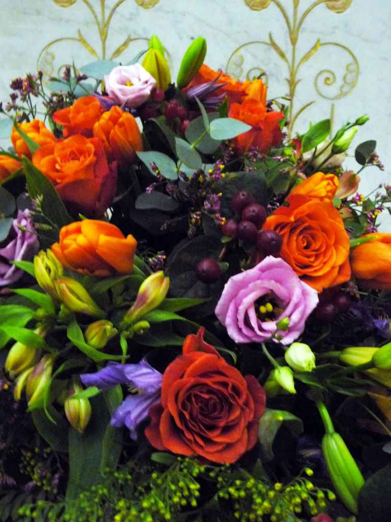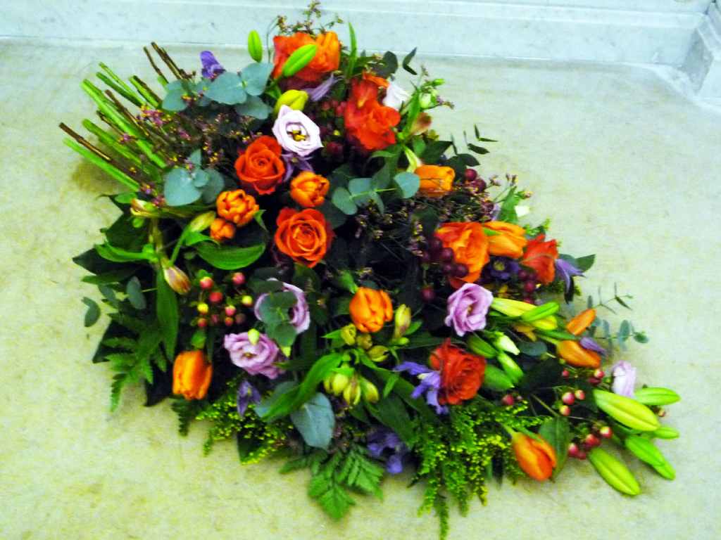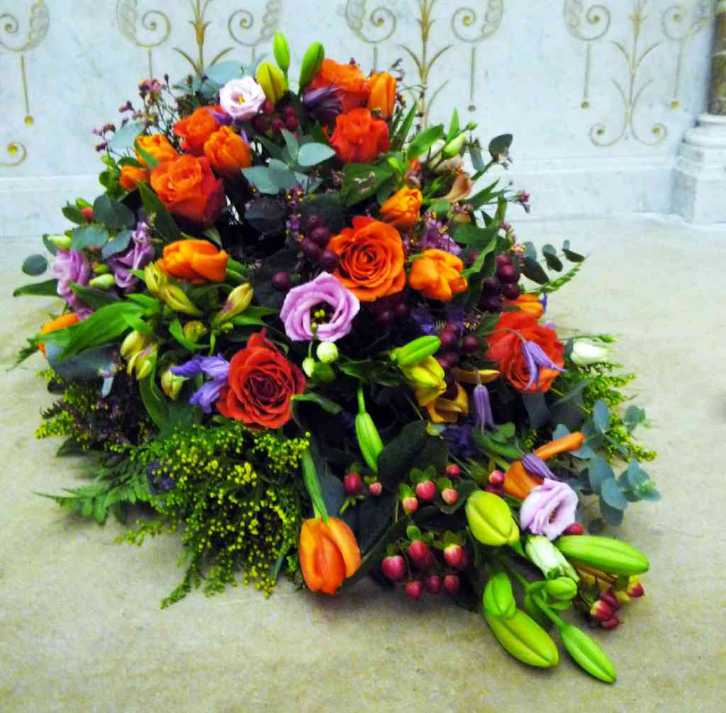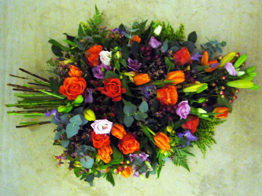Coussin long : tulipes oranges, lysentus violets, roses oranges, lys oranges