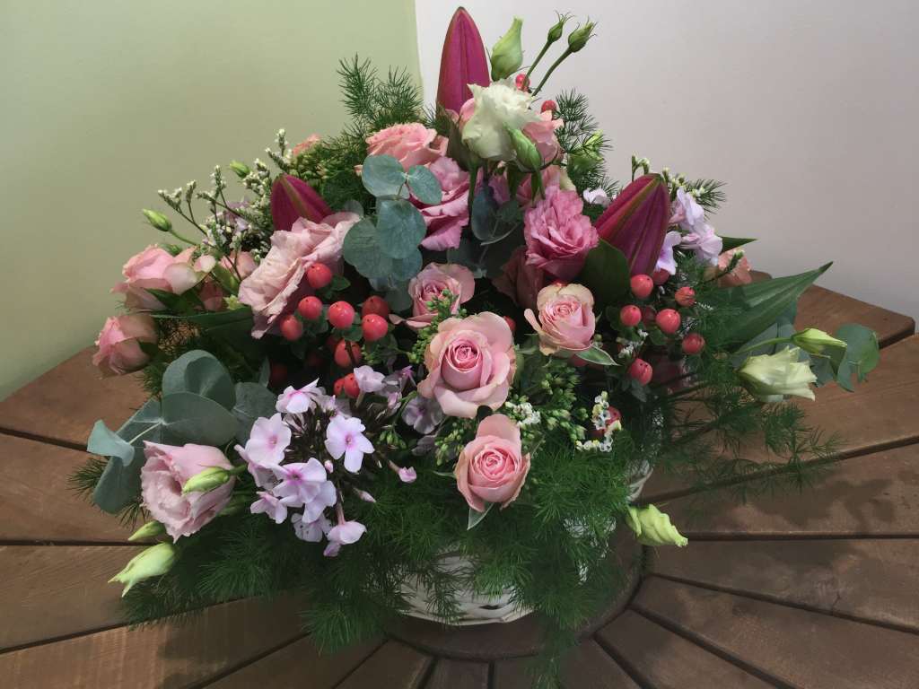 Panier rond : lys roses, roses roses, lysentus blancs