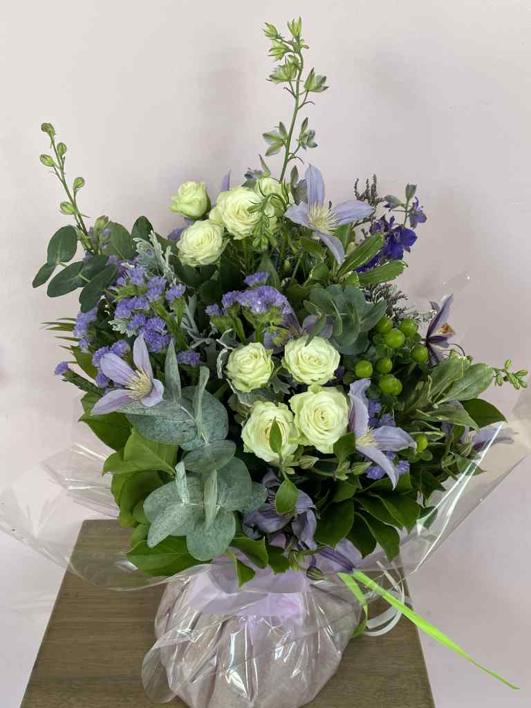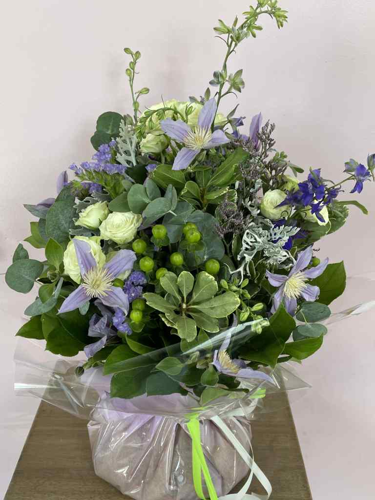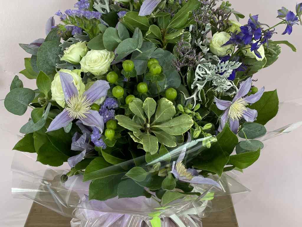 Bouquet bulle d’eau : lysentus blancs, clématites bleues